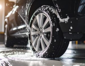 Firefly_Close-up-shot-of-a-tire-being-washed.-Lots-of-soap-bubbles.-72744